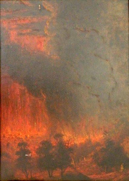 Bushfire, verso Mountainous Landscape falling away to the Sea