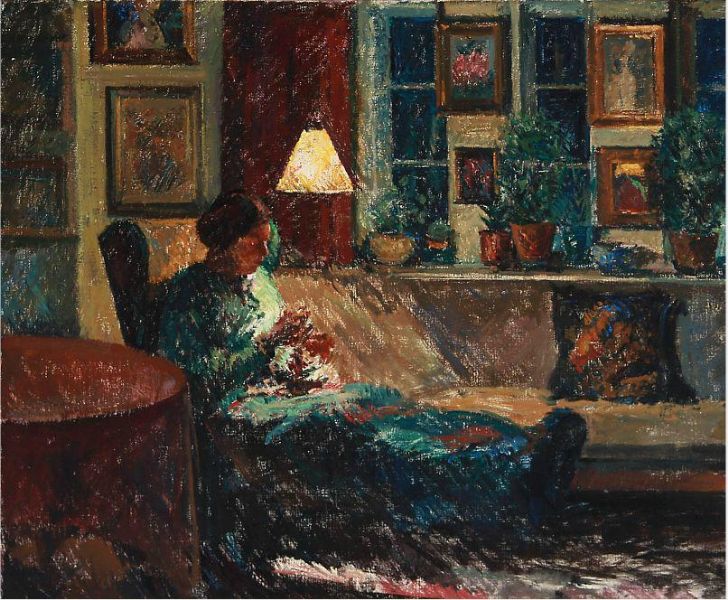 A woman sewing by the lamp