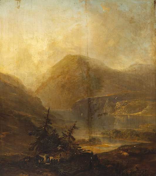 | THE POWERSCOURT WATERFALL, COUNTY WICKLOW and COTTAGE WITH FIGURES AND CATTLES BY A LAKE (A PAIR) | |