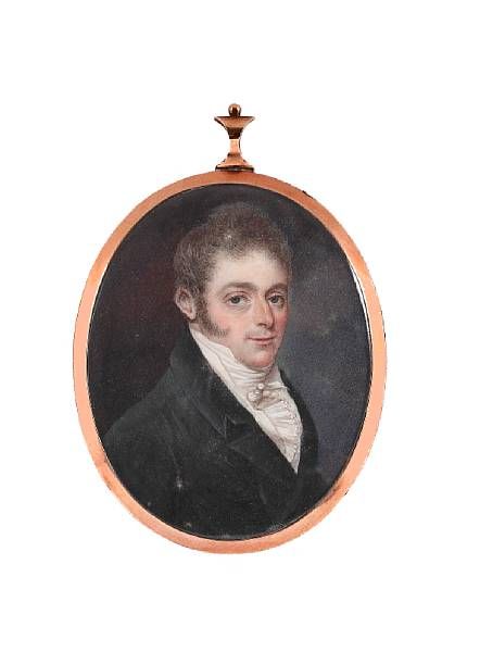 A Gentleman, wearing dark green coat with black collar, white waistcoat, frilled chemise, stock and tie