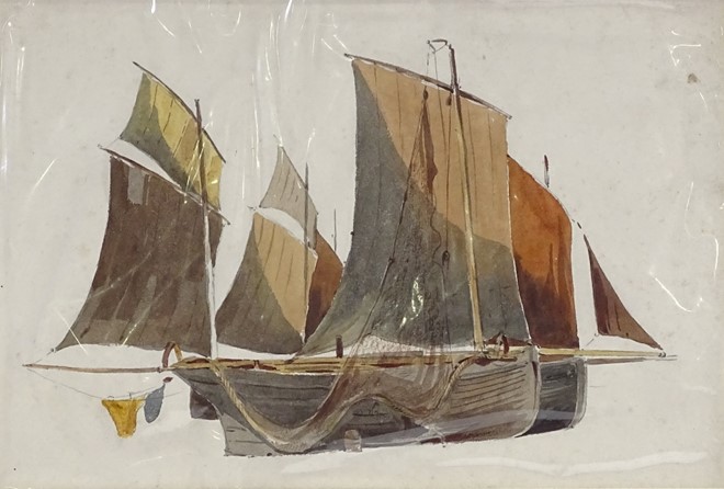 Beached gaff rigged trawlers drying their nets