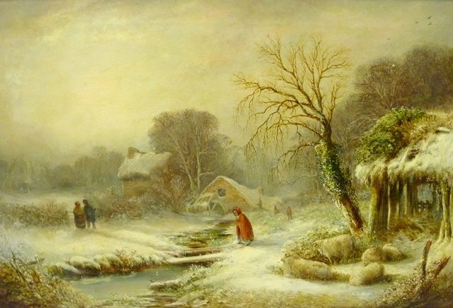 | Crossing the Fields to Church, figures crossing the fields in winter with sheep and robin nearby | |