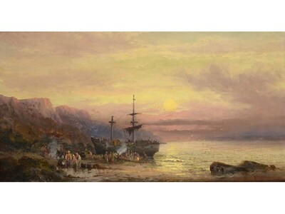 WRECKERS ON COAST AT SUNSET