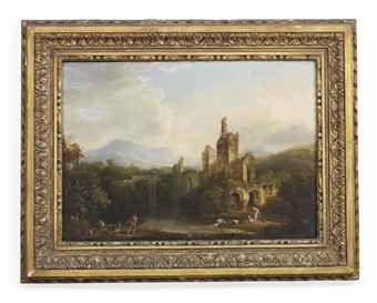 | A view of a castle with figures washing sheets and a goat herder on a river bank | |