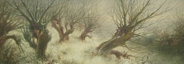 Coppiced willows in the snow on river bank, with a kingfisher on a bough
