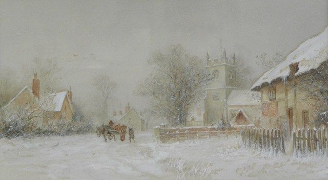 St Helen's Church, Clifford Chambers a winter snow scene with figures, horse and cart