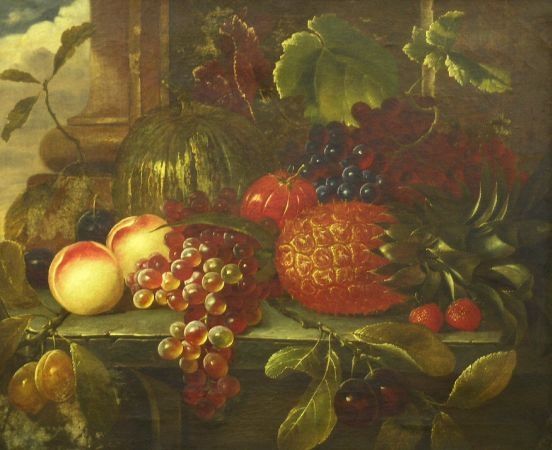 | STILL LIFE WITH PEACHES, A PINEAPPLE, GRAPES AND CHERRIES | |