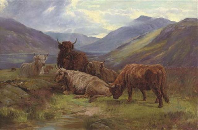 Highland cattle resting beside a loch