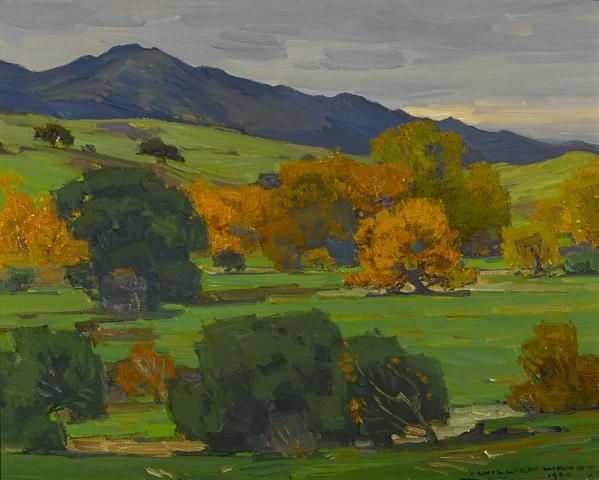 California landscape depicting autumn oaks on a rolling hillside with mountains beyond, 1924