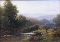 A figure and cattle on a river bank.