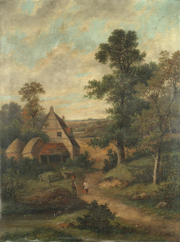 Rural scene with figures and poultry; Collecting hay by a cottage, a pair