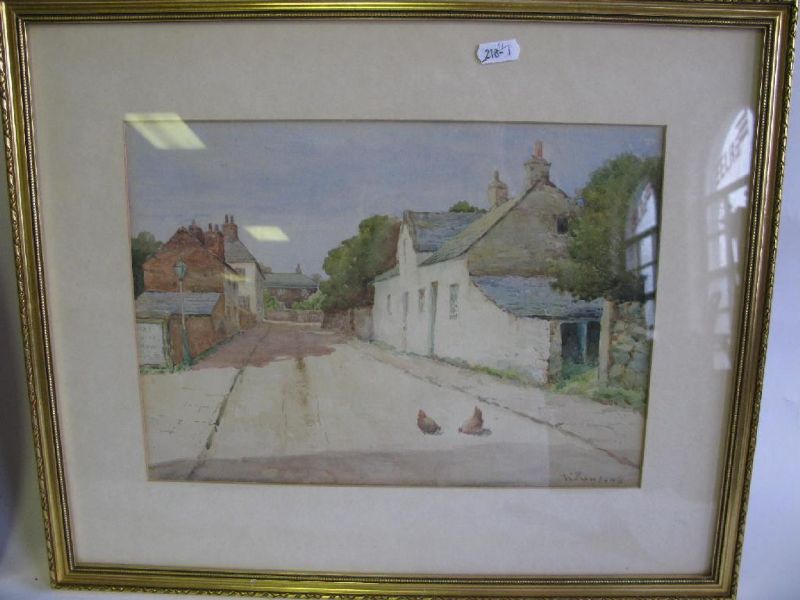 | A quiet sunlit street (possibly Crich, near Matlock), with two chickens feeding by shadow | |