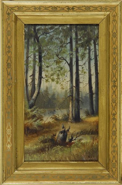 Forest interior with two rabbits and a brook in the distance