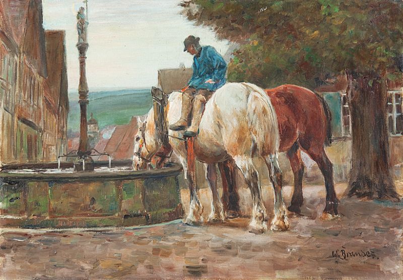 Zwei Ackergäule aus einem Stadtbrunnen trinkend.