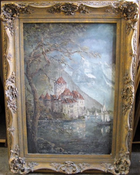 | Landscape, a high lake with sailboats, buildings and snowy mountains in background | |