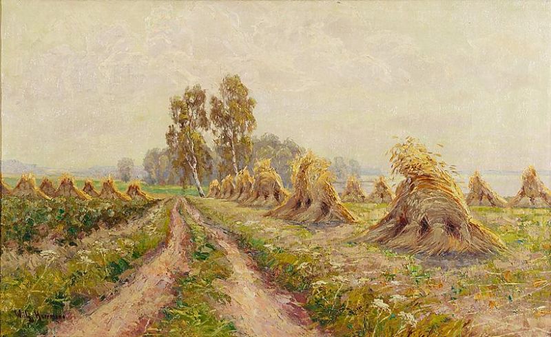 Abgeerntetes Kornfeld und aufgestellte Korngarben