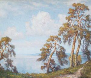 | Märkische Sommerlandschaft, ein mit Kiefern bestandenes Seeufer | |