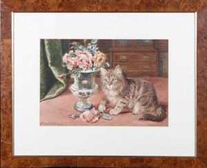 The pink rose - a kitten on a table top playing near a vase of flowers