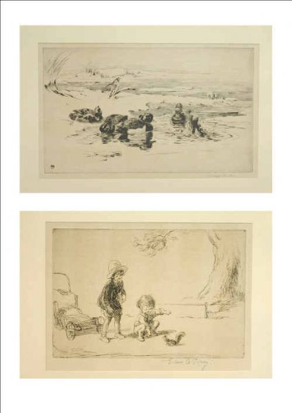 Print black and white drypoint etching, 2 items