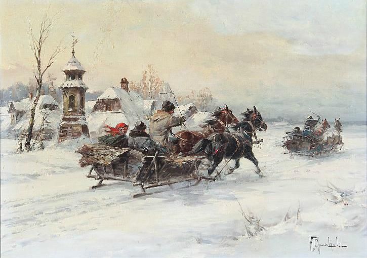 Sledge riding at a village, winter.