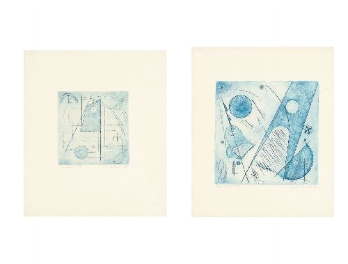 | Etching printed with tone in brown-black (2) resp. in blue-green (2) on wove paper with water mark, framed | |