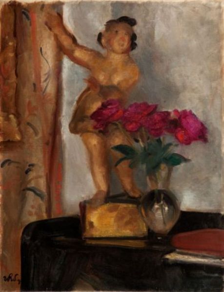 Martwa natura z figurką i peoniami