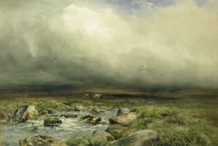 PONIES ON DARTMOOR, A ROCKY STREAM IN THE FOREGROUND