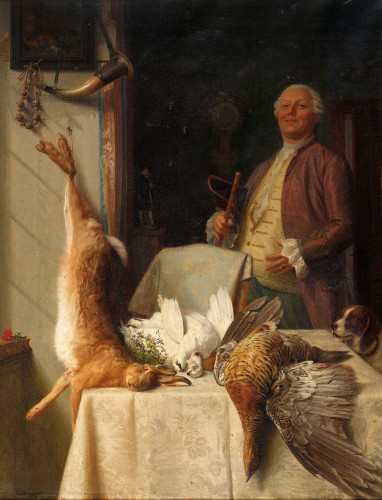 Adliger Herr mit Jagdhund und erlegtem Wild.
