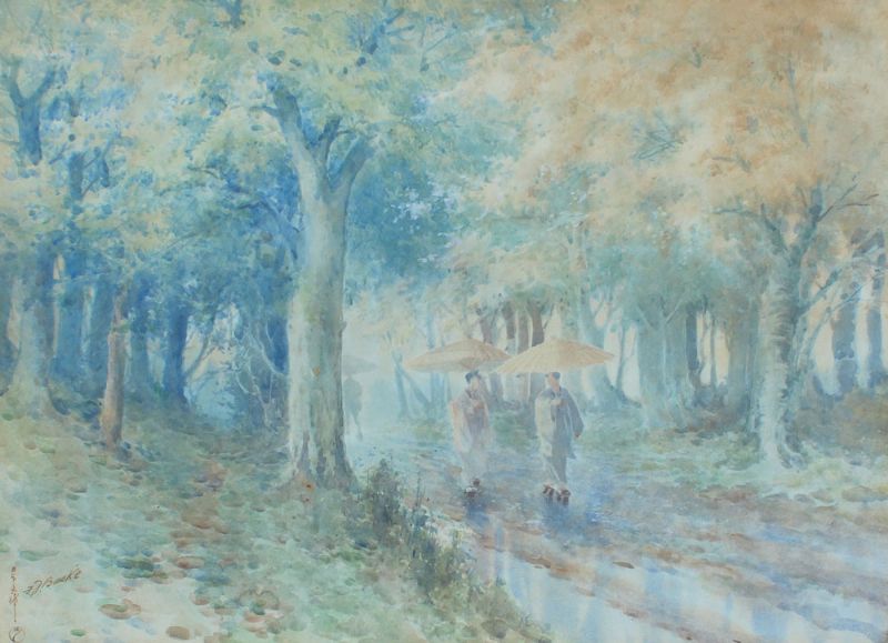 2 Japanese Women Traveling Along a Rainy Forest Path