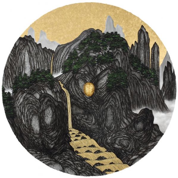 | Oil ink, oil, brain model with gold leaf on canvas mounted on board | |