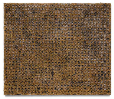 | Oil cardboard egg cartons, cotton batting, oil and ink stitched to linen | |
