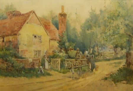 Figures, Donkey and Cart by a Country Cottage