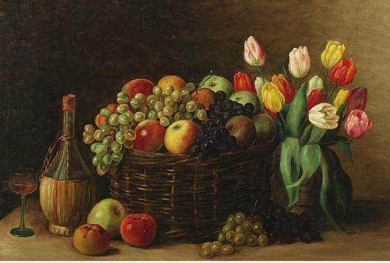 | Still life with fruit basket, wine and flowers | |