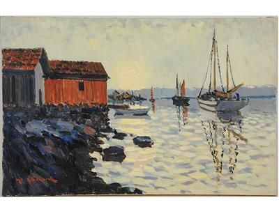 Kustbild with båtar vid sjöbodar