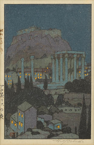 A small woodblock print (framed) entitled Akuroporisu no yoru (Moon Light Acropolis), dated 1928, signed Yoshida, signed in pencil H. Yoshida