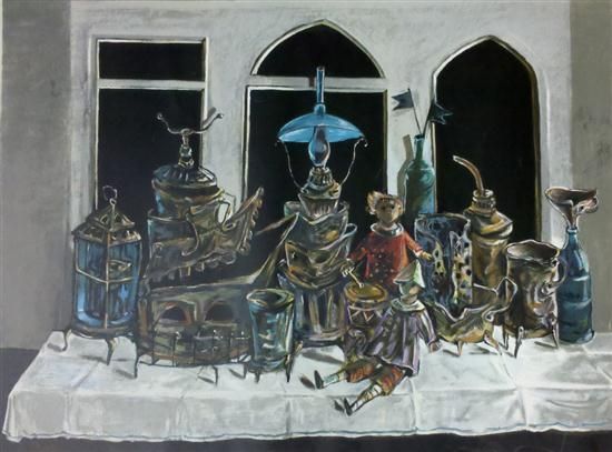 Still life with blue lamp and dolls