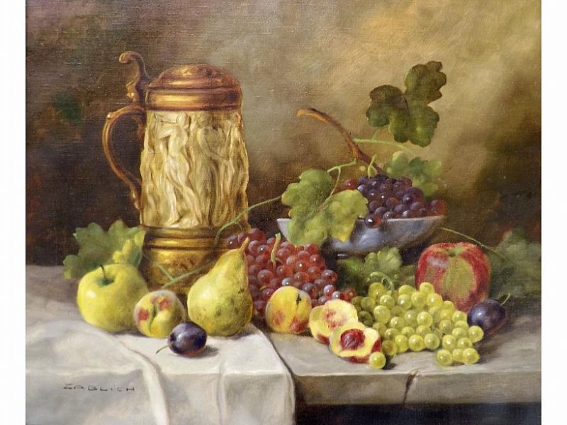 still life of fruit and a lidded stein