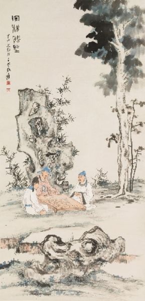 | Drei Gelehrte beim Brettspiel an einem bizarren Felsen und unter einem wutong-Baum | |