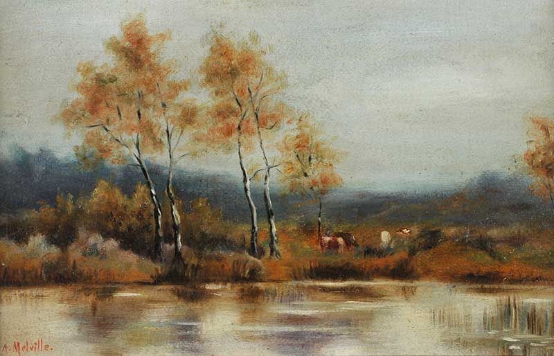 A Melville ( 1855 - 1904 ) was a British painter. A Melville s works have been auctioned off multiple times, with realized prices varying according to the size and medium of the artwork, for instance of 14.28 USD for CATTLE BY A RIVER in 2016