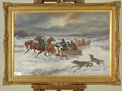 A Scheloumoff ( 1900 - ) is a Russian painter. A Scheloumoff s works have been put up for auction numerous times, with realized prices surpassing estimated prices, varying from 191.22 USD for Winterlandschaft mit Schlittengespann - Wolfsjagd in 2005 to 653.54 USD for Das Ausweichmanöver in 2013 , based on the size and medium of the artwork.