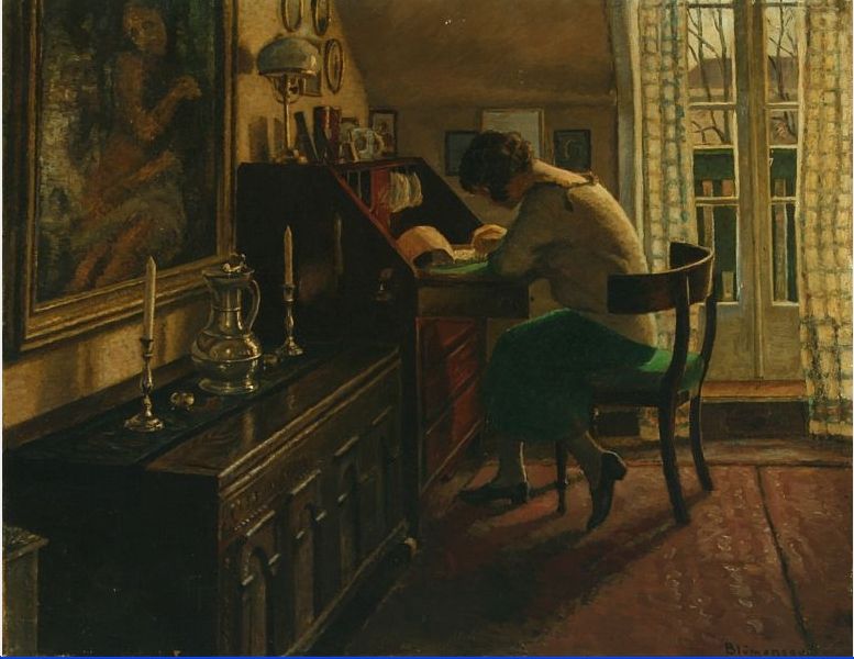 Aage Trolle Blumensaadt ( 1889 - 1939 ) was a Danish painter. Aage Trolle Blumensaadt s works have been put up for auction numerous times, with realized prices varying from 114.32 USD for A Danish autumn landscape. in 2006 to 184.77 USD for Interior with woman writing. in 2010 , based on the size and medium of the artwork.