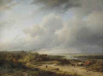 Abraham Johannes Couwenberg ( 1806 - 1844 ) was a Dutch painter. Abraham Johannes Couwenberg s works have been put up for auction numerous times, with realized prices surpassing estimated prices, varying from 1383.07 USD for An extensive river landscape with cattle on a hill-top in 2008 to 3437.84 USD for A riverlandscape with a horse-drawn cart in 2012 , based on the size and medium of the artw