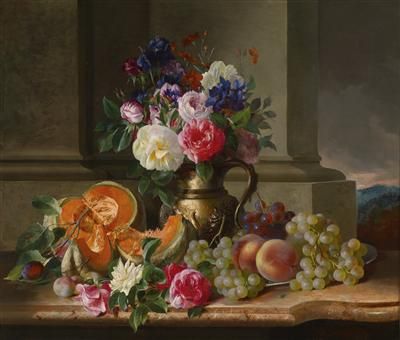 Adalbert Schaffer ( 1815 - 1871 ) was a Hungarian painter. Adalbert Schaffer s works have been put up for auction numerous times, with realized prices surpassing estimated prices, varying from 297.81 USD for A still life of a 17th century flagon, an engraved glass, oysters, crayfish, a sliced lemon and other objects on a stone ledge in 2004 to 7372.44 USD for A STILL LIFE WITH FRUIT, ROSES AND A