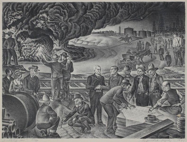 Alexander Hogue ( 1898 - 1994 ) was an American painter. Alexander Hogue s works have been auctioned off multiple times, with realized prices varying according to the size and medium of the artwork, for instance of 7500 USD for SPINDLETOP - 1901 in 2014
