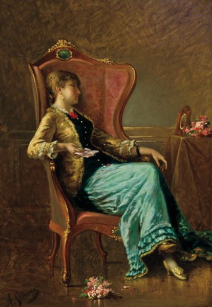 Alfred George Stevens ( 1817 - 1875 ) was a British painter. Alfred George Stevens s works have been put up for auction numerous times, with realized prices surpassing estimated prices, varying from 326.92 USD for Dead game and a basket on a ledge in 2004 to 12000 USD for The Love Letter in 2012 , based on the size and medium of the artwork.