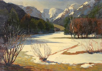 Alfred Pöll ( 1867 - 1929 ) was an Austrian painter. Alfred Pöll s works have been put up for auction numerous times, with realized prices surpassing estimated prices, varying from 4136.89 USD for Schiederweiher mit Spitzmauer und Priel in 2004 to 19611.48 USD for Landschaft mit Schneefeldern in 2009 , based on the size and medium of the artwork.