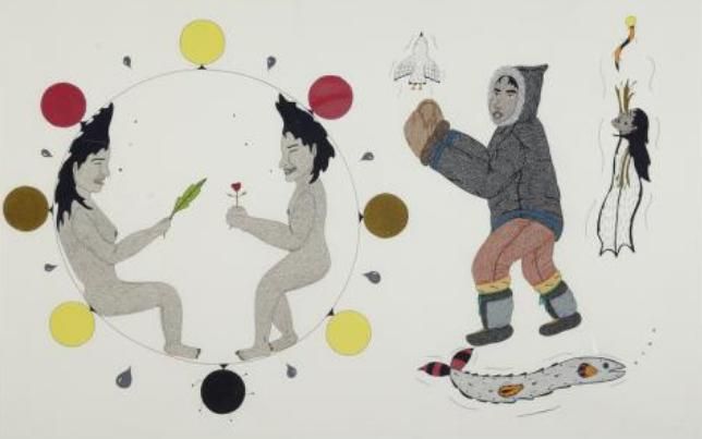 Annie Pootoogook ( - ) is a painter. Annie Pootoogook s works have been put up for auction numerous times, with realized prices surpassing estimated prices, varying from 1295.66 USD for FISHING in 2014 to 2159.44 USD for HAPPY COUPLE IN LOVE in 2014 , based on the size and medium of the artwork.
