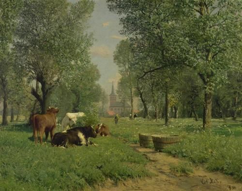 Carl Roder ( 1852 - 1922 ) was a German painter. Carl Roder s works have been put up for auction numerous times, with realized prices varying from 2254.25 USD for A quiet morning. Cowherd lingering by the riverbank in 2007 to 3266.68 USD for Meadow with cows and a church in the background in 2008 , based on the size and medium of the artwork.