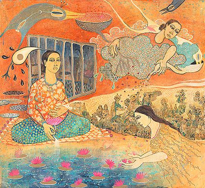 Dhruvi Acharya ( 1971 - ) is a painter. Dhruvi Acharya s works have been put up for auction numerous times, with realized prices varying from 4472.96 USD for Metamorph II (I) in 2008 to 9012 USD for The Future is the Past is the Present in 2013 , based on the size and medium of the artwork.