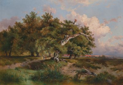 Dominik Schuhfried ( 1810 - ) is an Austrian painter. Dominik Schuhfried s works have been put up for auction numerous times, with realized prices surpassing estimated prices, varying from 3383.24 USD for Resting in the forest in 2003 to 3778.72 USD for Evening Ambience with Shepherds under a Gnarled Tree in 2009 , based on the size and medium of the artwork.
